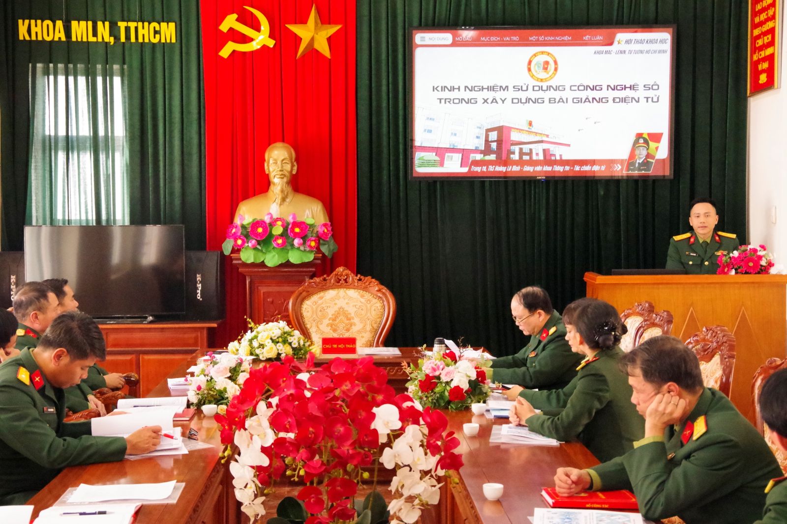 Phát biểu khai mạc Hội thảo, Đại tá, TS Đỗ Quang Lưu - Phó Chủ nhiệm Khoa nhấn mạnh: Ứng dụng công nghệ số vào nâng cao chất lượng giảng dạy ở Khoa Mác - Lênin, tư tưởng Hồ Chí Minh hiện nay không chỉ là cần thiết, cấp bách và phù hợp với tiến trình xây dựng Học viện Lục quân thông minh, hiện đại. Đây cũng là xu thế phát triển chung của nền giáo dục Việt Nam hiện nay.