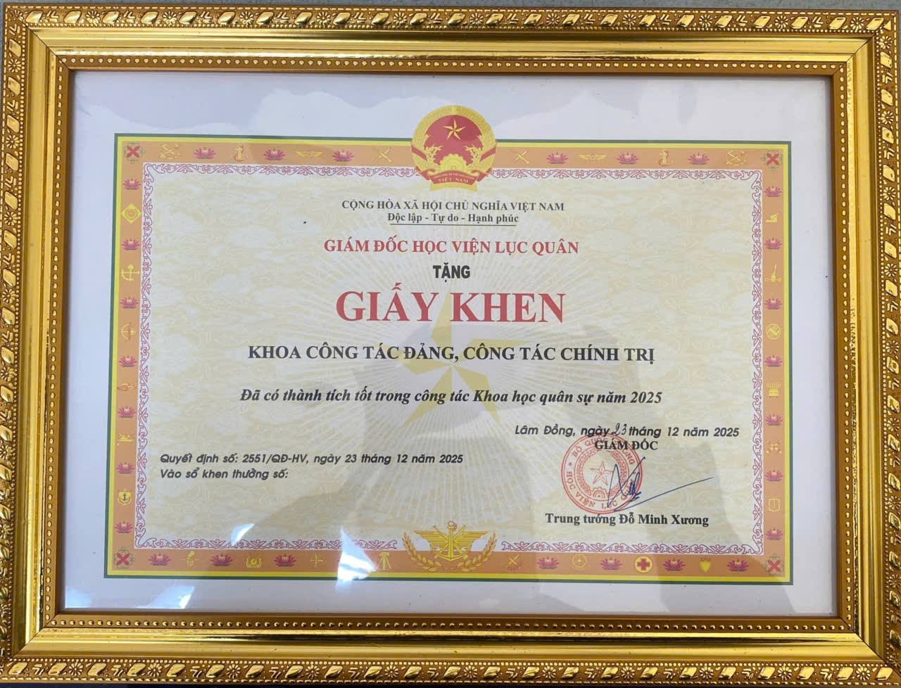 Ghi nhận những nỗ lực, cố gắng và kết quả nổi bật trong thực hiện nhiệm vụ khoa học quân sự năm 2025, tập thể Khoa Công tác đảng, công tác chính trị đã được đề nghị và quyết định tặng Giấy khen của Thủ trưởng Học viện. Đồng thời, đồng chí Chủ nhiệm Khoa cũng được tặng Giấy khen vì có thành tích xuất sắc, đóng góp tích cực, hiệu quả trong công tác nghiên cứu khoa học quân sự.