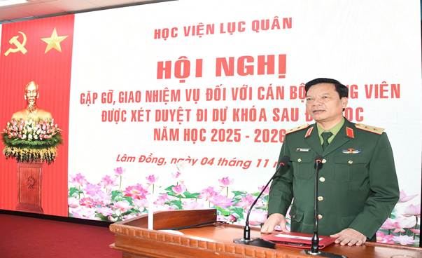 Thay mặt Thường vụ Đảng ủy, Ban Giám đốc Học viện, đồng chí Trung tướng Trần Danh Khải - Bí Thư Đảng ủy, Chính ủy Học viện chúc mừng các đồng chí đã được Tổng cục Chính trị xét duyệt đi dự khóa đào tạo sau đại học năm học 2025 - 2026, ghi nhận những kết quả đã đạt được của các cấp ủy trong thời gian qua đã làm tốt công tác tạo nguồn và giới thiệu nguồn cán bộ tham gia các loại hình đào tạo cả trong và ngoài Quân đội, cả trong nước và nước ngoài. Để xây dựng đội ngũ cán bộ, giảng viên có chất lượng cao, đáp ứng yêu cầu xây dựng Học viện vững mạnh toàn diện, “mẫu mực tiêu biểu”, đồng chí Bí thư Đảng ủy Học viện yêu cầu:
