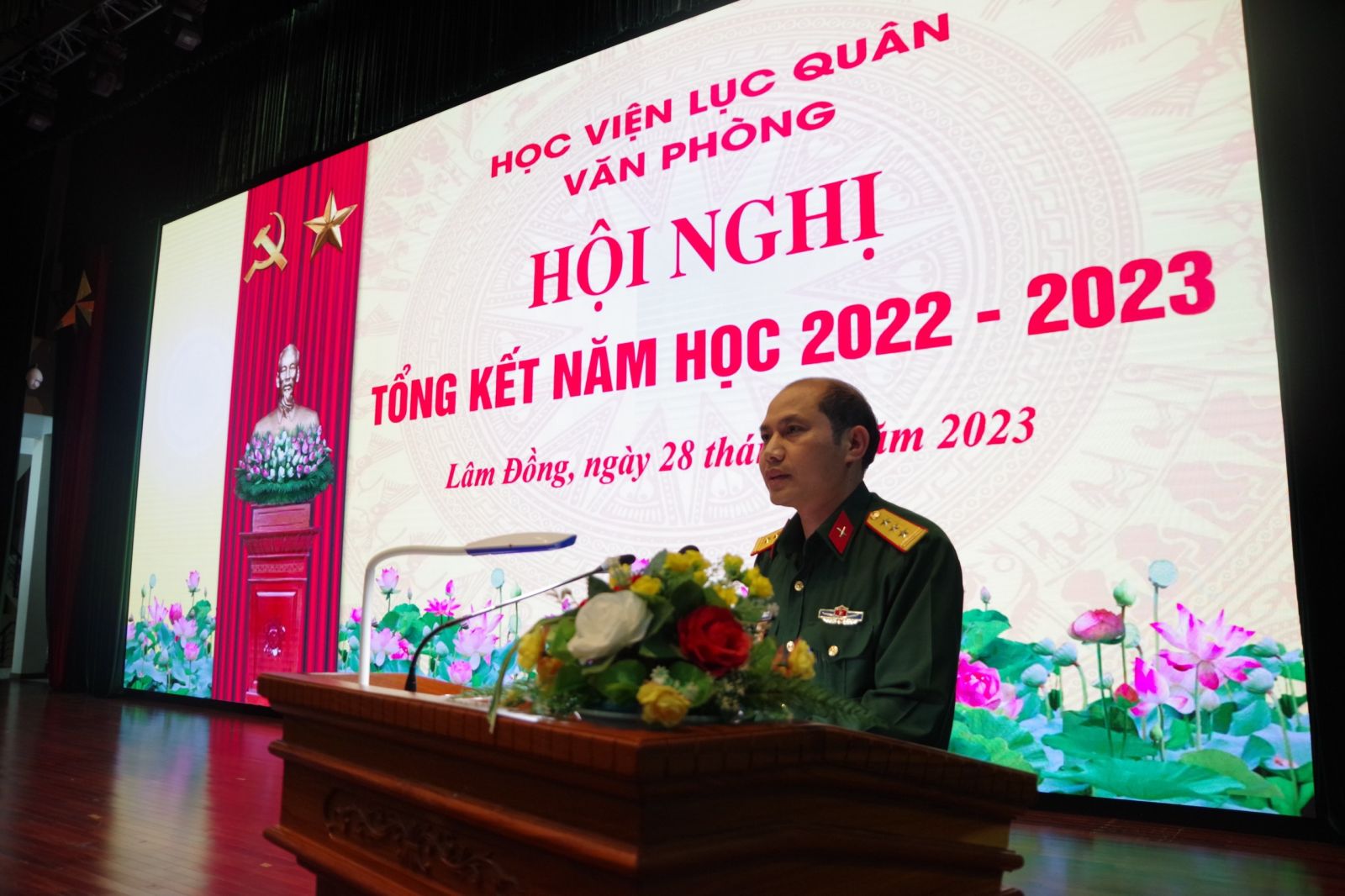 Thay mặt Đảng ủy, chỉ huy Văn phòng, đồng chí Thượng tá Lê Ngọc Huệ Bí thư Đảng ủy, Phó Chánh Văn phòng báo cáo tóm tắt kết quả thực hiện nhiệm vụ năm học 2022 - 2023 và phương hướng nhiệm vụ năm học 2023 - 2024;