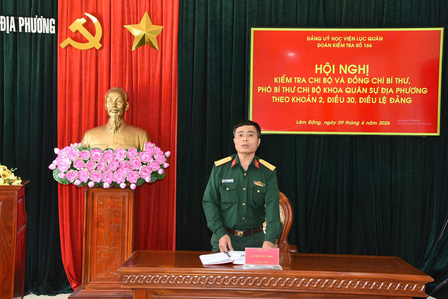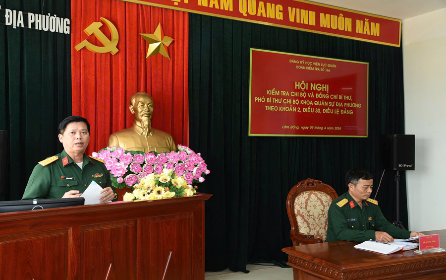 Thực hiện Quyết định số 166-QĐ/ĐU ngày 24/3/2026 của Đảng ủy Học viện Lục quân, chiều ngày 09/4/2026, Đoàn Kiểm tra Số 166 của Đảng ủy Học viện Lục quân đã tiến hành kiểm tra Chi bộ và các đồng chí Bí thư, Phó Bí thư Chi bộ Khoa Quân sự địa phương theo Khoản 2, Điều 30, Điều lệ Đảng.
