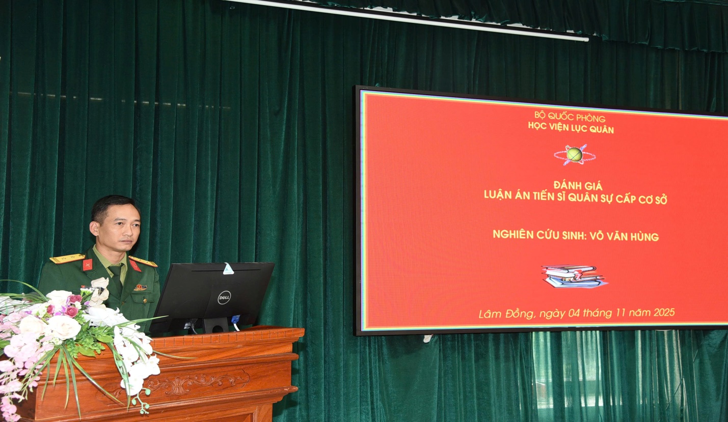 Thực hiện Quyết định số 2030/QĐ-HV ngày 10 tháng 10 năm 2025 của Giám đốc Học viện Lục quân về việc thành lập Hội đồng đánh giá luận án tiến sĩ quân sự cho nghiên cứu sinh Khóa 33A, ngày 04/11/2025, Học viện Lục quân tổ chức đánh giá luận án cho 02 nghiên cứu sinh Lê Thanh Hải và Võ Văn Hùng - Khóa 33A.