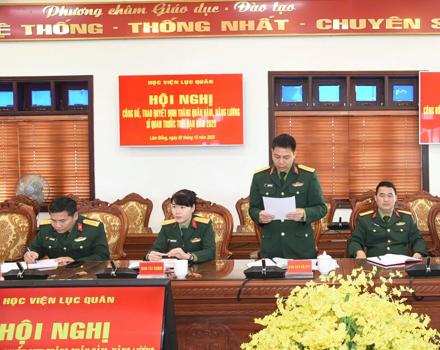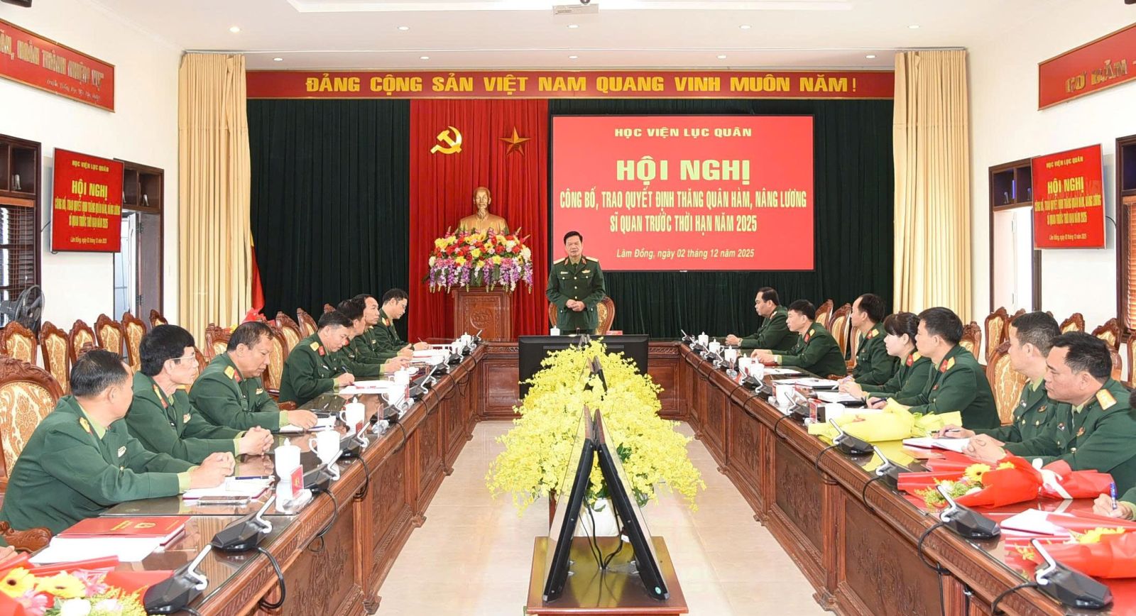 Sáng ngày 02/12/2025 Học viện Lục quân đã tổ chức Hội nghị công bố, trao quyết dịnh thăng quân hàm, nâng lương sĩ quan trước thời hạn năm 2025. Dự và chủ trì Hội nghị có đồng chí Trung tướng Trần Danh Khải - Bí Thư Đảng ủy, Chính ủy Học viện. Tham dự hội nghị còn có Thủ trưởng trong Thường vụ Đảng ủy, Ban Giám đốc Học viện, đại biểu đại diện lãnh đạo, chỉ huy các cơ quan, đơn vị cùng các đồng chí cán bộ nhận quyết định.