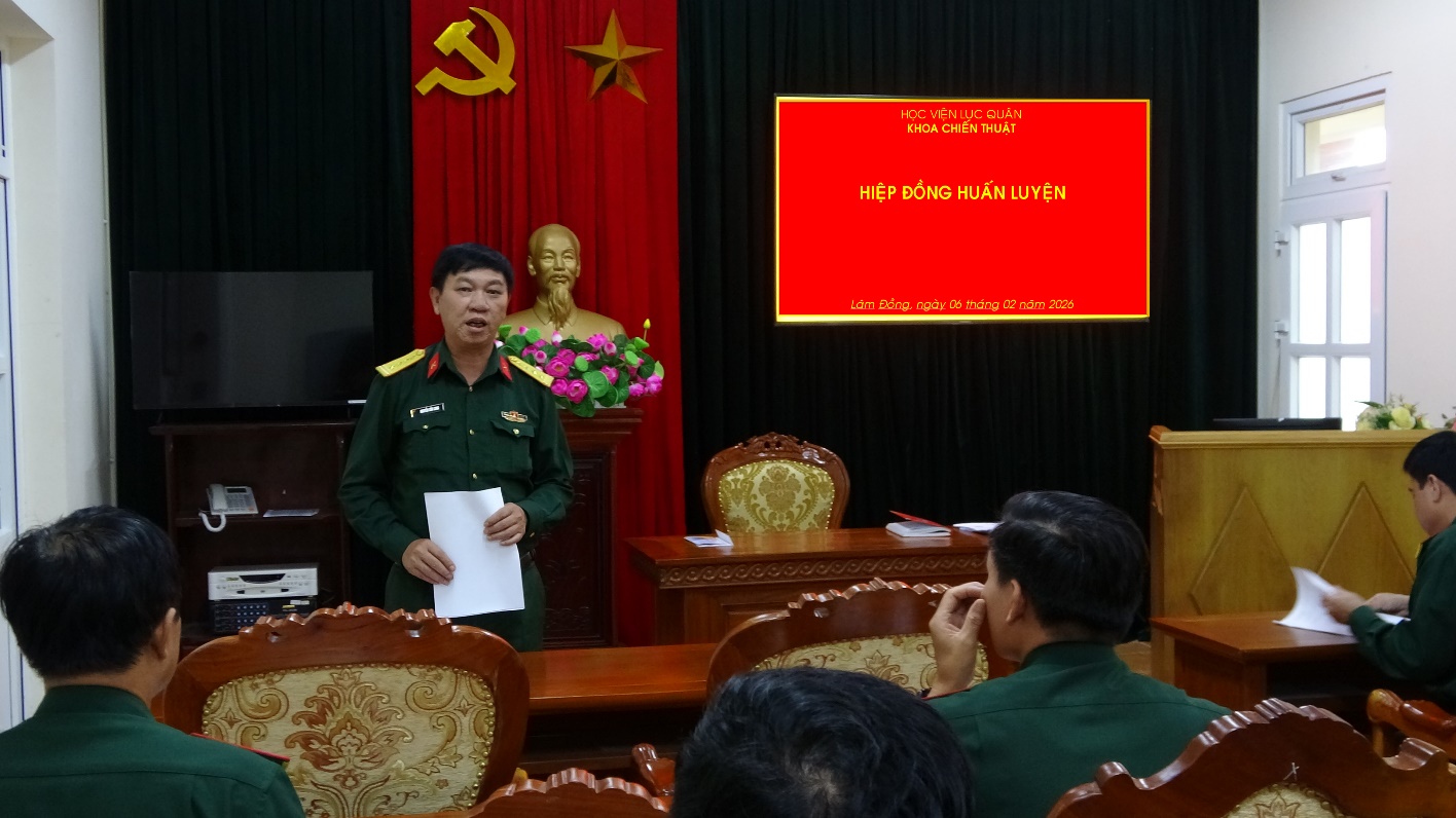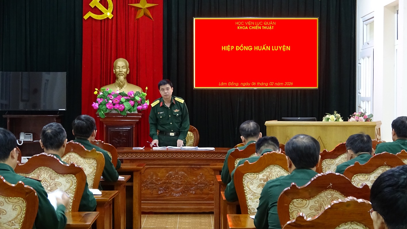 Thực hiện Kế hoạch số 175/QĐ-HV ngày 20 tháng 01 năm 2026 đã được Phó Giám đốc Học viện phê chuẩn về tổ chức luyện tập Chỉ huy - Cơ quan 1 bên, 1 cấp trên bản đồ cho học viên đào tạo Trung đoàn trưởng Bộ binh (Đ61), từ ngày 02 đến ngày 19 tháng 3 năm 2026, Khoa Chiến thuật đã phối hợp hiệp đồng chặt chẽ với cơ quan, các khoa giảng viên chủ động làm tốt công tác chuẩn bị mọi mặt cho các đợt luyện tập để đạt kết quả tốt nhất, đáp ứng mục đích, yêu cầu, nhiệm vụ đề ra.