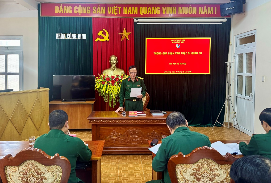 Thực hiện kế hoạch đào tạo của Phòng Sau đại học, chiều ngày 24/10/2025, Khoa Công binh đã tổ chức Hội thảo khoa học thông qua luận văn thạc sĩ quân sự, chuyên ngành công binh cho học viên cao học 32. Đồng chí Đại tá, Tiến sĩ Nguyễn Văn Luật - Chủ nhiệm Khoa Công binh, Chủ trì buổi Hội thảo, tham dự còn có các nhà khoa học đầu ngành, đại biểu chỉ huy Phòng Sau đại học, giảng viên hướng dẫn khoa học, Tổ khoa học của Khoa và các đồng chí học viên Hệ 2 được phân công sinh hoạt khoa học tại Khoa Công binh.
