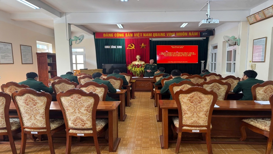 Bên cạnh công tác chuyên môn, Khoa Công binh đặc biệt chú trọng việc nâng cao nhận thức trách nhiệm học tập cho học viên. Thông qua các buổi sinh hoạt trước kỳ nghỉ Tết, Chỉ huy Khoa đã tiến hành gặp gỡ và quán triệt rõ yêu cầu của học kỳ II đối với các lớp học viên chuyên ngành công binh, với khối lượng kiến thức lớn, nhiều học phần chuyên sâu, đòi hỏi mỗi học viên phải nâng cao tinh thần tự giác, ý thức kỷ luật và phương pháp học tập khoa học. Việc định hướng tư tưởng từ sớm giúp học viên khi trở lại sau Tết nhanh chóng ổn định nền nếp, tập trung vào nhiệm vụ học tập, không bị ảnh hưởng bởi tâm lý nghỉ lễ kéo dài.