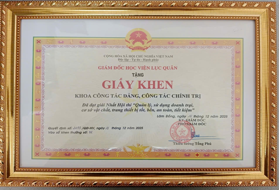 Trong không khí thi đua sôi nổi lập thành tích chào mừng các ngày lễ lớn của Đảng, Nhà nước, Quân đội và góp phần hướng tới xây dựng Học viện Lục quân chính quy, hiện đại, xanh – sạch – đẹp, Khoa Công tác đảng, công tác chính trị đã xuất sắc đạt Giải Nhất trong Hội thi “Quản lý, sử dụng doanh trại, cơ sở vật chất, trang thiết bị tốt, bền, an toàn, tiết kiệm” do Học viện Lục quân tổ chức. Đây là kết quả nổi bật, thể hiện sự nỗ lực, tinh thần trách nhiệm cao và quyết tâm chính trị mạnh mẽ của cấp ủy, chỉ huy cùng toàn thể cán bộ, giảng viên trong Khoa.