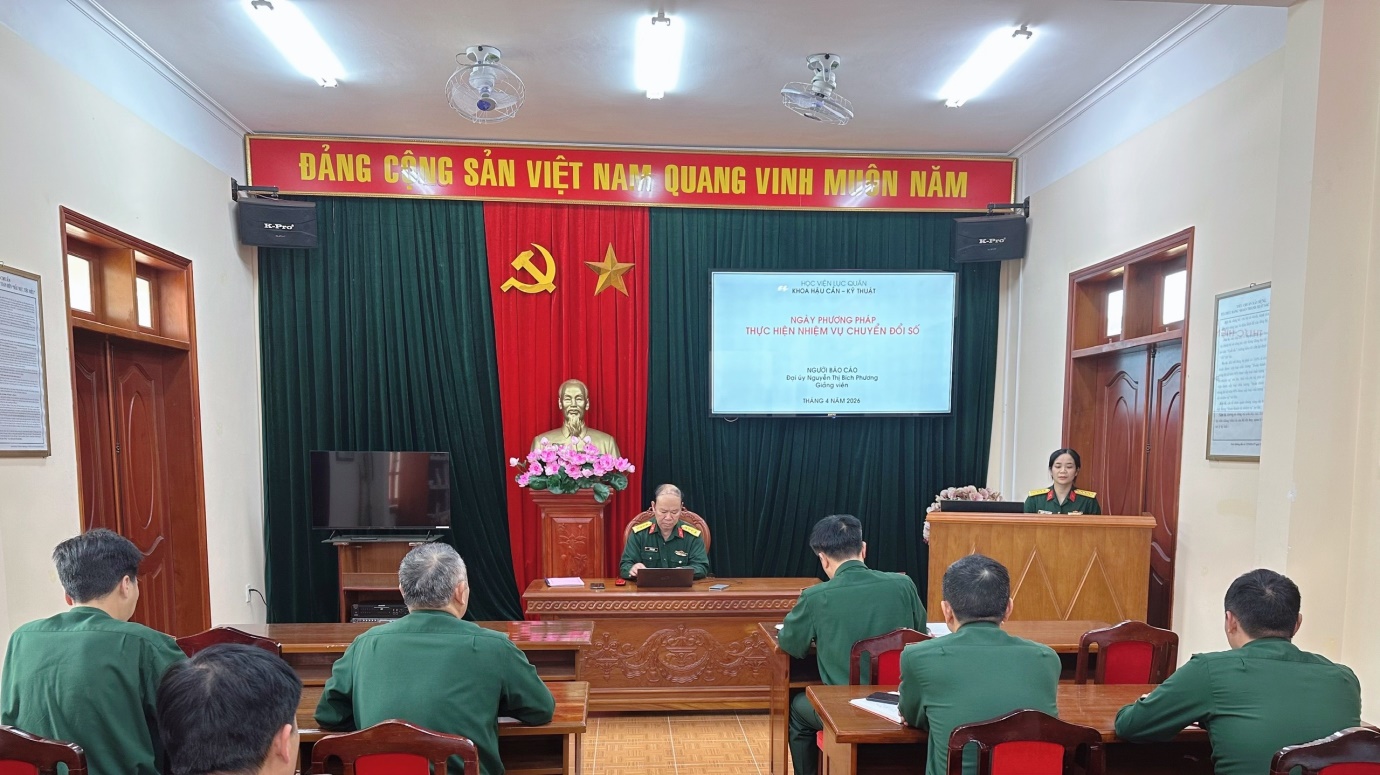 Ngày Phương pháp với chủ đề “Thực hiện nhiệm vụ chuyển đổi số trong Khoa Hậu cần - Kỹ thuật” do Đại tá Đỗ Hữu Long - Chủ nhiệm khoa chủ trì. Đây là nội dung sinh hoạt chuyên môn định kỳ hằng tuần của Khoa, góp phần kịp thời quán triệt chủ trương, thống nhất nhận thức và nâng cao chất lượng thực hiện nhiệm vụ, đồng thời trao đổi, thống nhất những vấn đề cần tập trung nâng cao chất lượng trong giảng dạy, nghiên cứu khoa học và công tác quản lý.