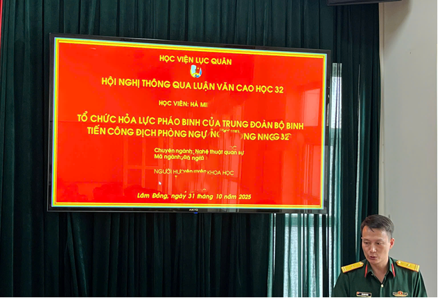 Chiều ngày 31/10/2025, Khoa Pháo binh đã tổ chức Hội nghị thông qua luận văn cho 3 đồng chí học viên cao học Khóa 32. Tham dự hội nghị có: đại biểu Phòng Sau đại học, Hệ 2, một số chuyên gia, nhà khoa học, cán bộ hướng dẫn, các thành viên tổ khoa học và đông đủ giảng viên Khoa Pháo binh cùng học viên đào tạo sau đại học đang sinh hoạt khoa học tại Khoa.