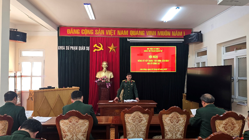Căn cứ Thông báo số 239/TB-HV ngày 28 tháng 01 năm 2026 về việc tổ chức treo cờ Tổ quốc và đăng ký cam kết xây dựng gia đình văn hóa tại khu nhà ở công vụ Học viện. Sáng ngày 02 tháng 02 năm 2026, Khoa Sư phạm quân sự đã tổ chức hội nghị đăng ký xây dựng “Gia đình văn hóa” cho cán bộ, giảng viên là chủ hộ gia đình tại khu nhà ở công vụ.
