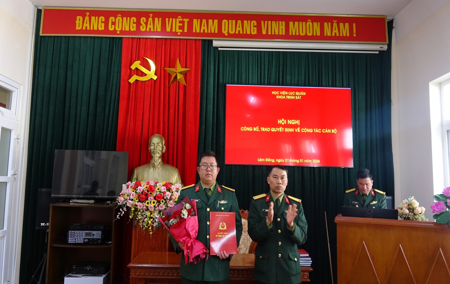 Được sự ủy quyền của Thường vụ Đảng ủy, Ban Giám đốc Học viện Lục quân, chiều ngày 21/01/2026 cấp ủy, chỉ huy Khoa Trinh sát đã tổ chức Hội nghị công bố, trao quyết định cho cán bộ đi thực tế đơn vị cơ sở quý I năm 2026. Dự và chủ trì Hội nghị có đồng chí Đại tá, Tiến sĩ Bùi Đình Quyền, Chủ nhiệm Khoa; các đồng chí trong cấp ủy, chỉ huy Khoa Trinh sát; đồng chí Thiếu tá Nguyễn Văn Tú, đại biểu Ban Cán bộ, Phòng Chính trị, Học viện Lục quân, cùng toàn thể cán bộ, giảng viên trong Khoa. Đây là hoạt động có ý nghĩa quan trọng, thể hiện sự quan tâm sâu sắc của Đảng ủy, Ban Giám đốc Học viện và cấp ủy, chỉ huy Khoa Trinh sát đối với công tác xây dựng đội ngũ cán bộ, giảng viên đáp ứng yêu cầu nhiệm vụ trong tình hình mới.