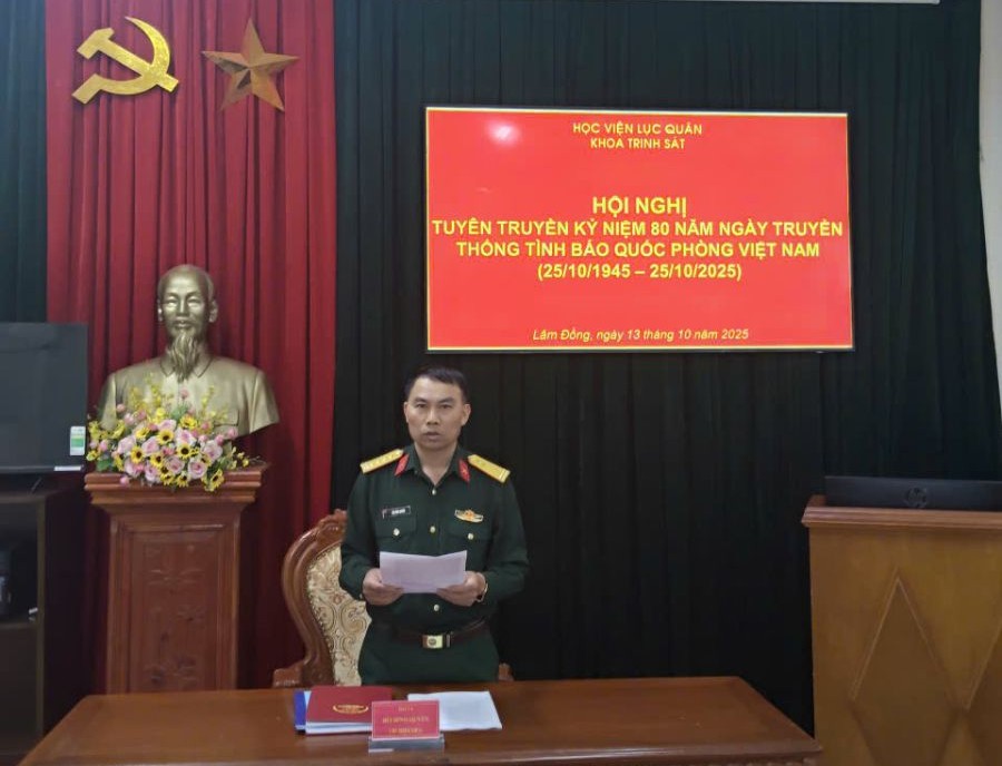 Hòa trong không khí thi đua sôi nổi của toàn quân hướng tới kỷ niệm 80 năm Ngày Truyền thống Tình báo Quốc phòng Việt Nam, chiều ngày 13 tháng 10 năm 2025, Khoa Trinh sát - Học viện Lục quân đã tổ chức buổi sinh hoạt tuyên truyền nhằm ôn lại truyền thống vẻ vang, hào hùng của lực lượng Tình báo Quốc phòng Việt Nam (25/10/1945 - 25/10/2025). Buổi sinh hoạt do Đại tá, Tiến sĩ Bùi Đình Quyền - Chủ nhiệm Khoa Trinh sát chủ trì, với sự tham dự của toàn thể cán bộ, giảng viên trong Khoa.