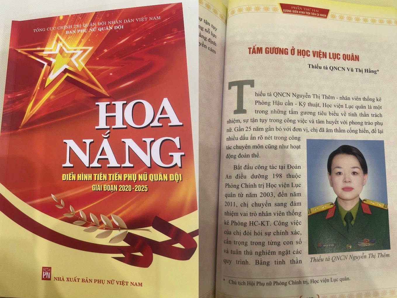 Hình ảnh bài viết về Trung tá QNCN Nguyễn Thị Thêm được giới thiệu trong ấn phẩm “Hoa Nắng - Điển hình tiên tiến phụ nữ Quân đội giai đoạn 2020 -2025” do Tổng cục Chính trị Quân đội nhân dân Việt Nam – Ban Phụ nữ Quân đội biên soạn, Nhà xuất bản Phụ nữ Việt Nam phát hành