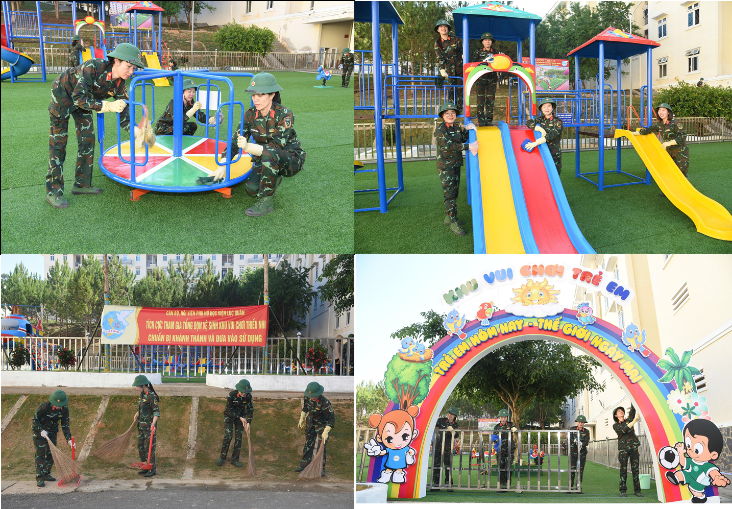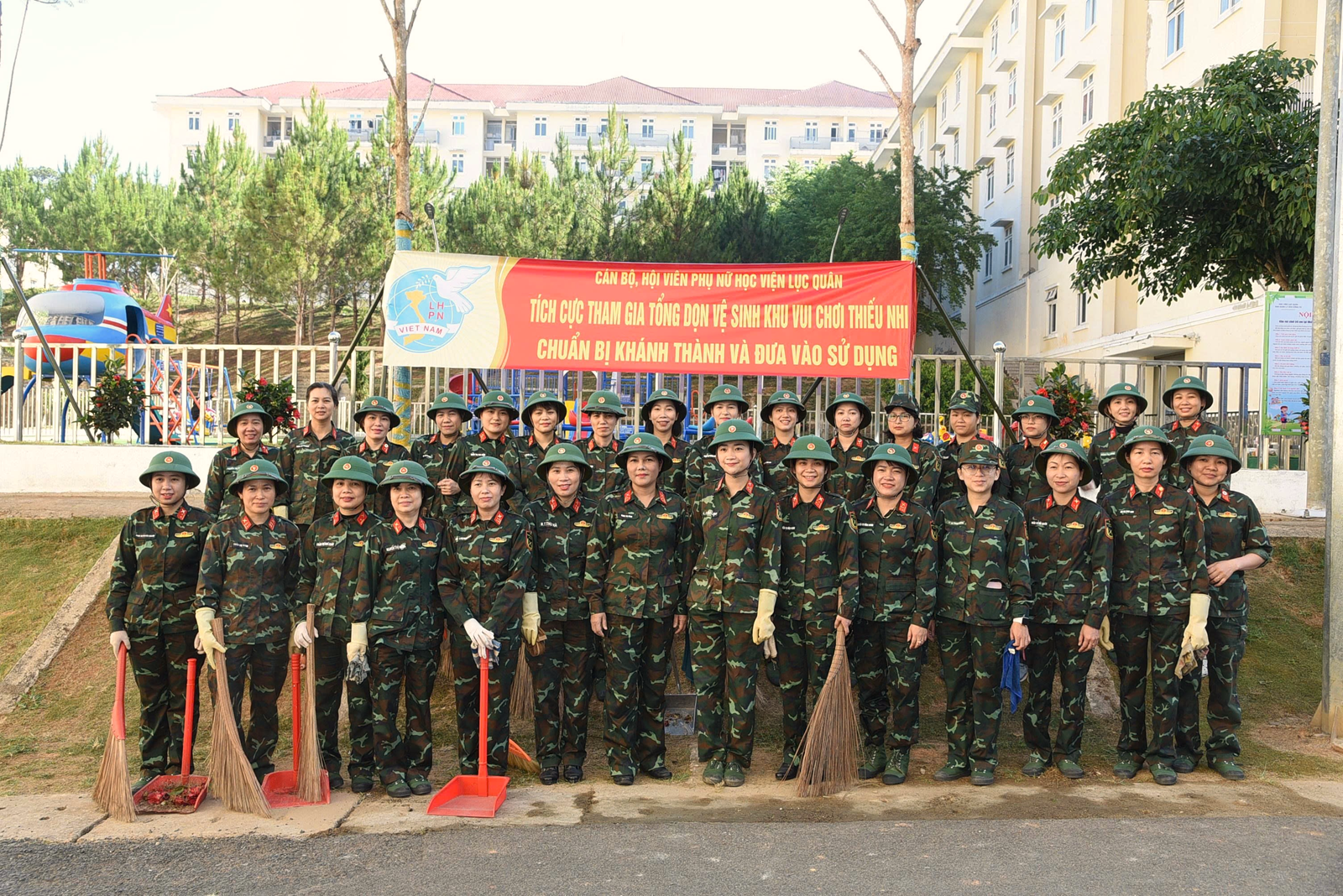 Cán bộ, hội viên phụ nữ Học viện Lục quân tích cực tham gia tổng dọn vệ sinh khu vui chơi thiếu nhi, chuẩn bị khánh thành và đưa vào sử dụng