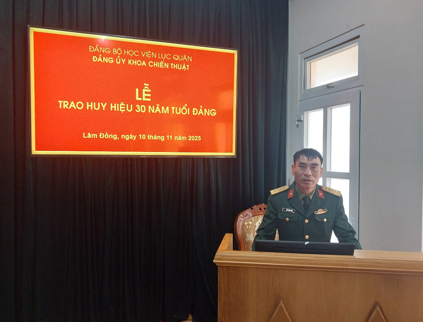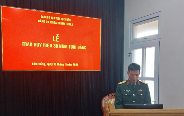 Thừa ủy quyền của Ban Thường vụ Đảng ủy Học viện Lục quân, ngày 10 tháng 11 năm 2025, Đảng bộ Khoa Chiến thuật đã long trọng tổ chức Lễ trao tặng Huy hiệu 30 năm tuổi Đảng cho đồng chí Trần Đăng Ninh - Đảng viên Chi bộ Bộ môn Chiến thuật Tiến công. Tham dự buổi Lễ có các đồng chí trong Đảng ủy, Chỉ huy Khoa cùng toàn thể đảng viên trong Đảng bộ.