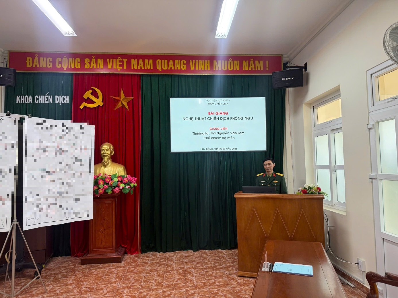 Tiết 7 - 9 ngày 09 và ngày 11/3/2026, 02 đồng chí giảng viên của Khoa Chiến dịch thi giảng bài và bảo vệ quyết tâm tác chiến. Chủ tịch Tiểu ban số 01, Thiếu tướng Nguyễn Văn Hậu - Phó Giám đốc Học viện.