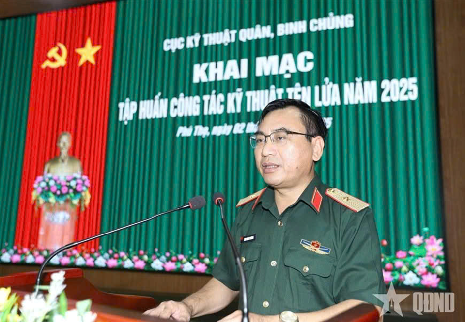Đồng chí Thiếu tướng Đinh Công Phương, Phó chủ nhiệm Tổng cục Hậu cần - Kỹ thuật phát biểu khai mạc đợt tập huấn công tác kỹ thuật tên lửa năm 2025.