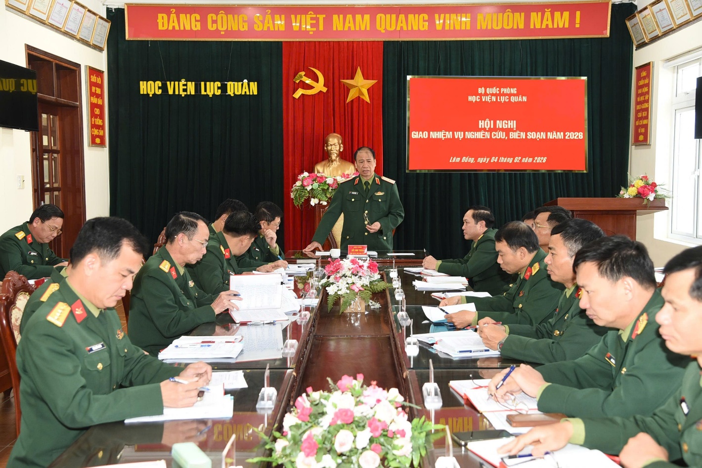 Nhằm nêu cao tinh thần trách nhiệm của lãnh đạo, chỉ huy các cơ quan, đơn vị và cán bộ thực hiện nhiệm vụ nghiên cứu, biên soạn các đề tài, tài liệu, sáng kiến, cải tiến kỹ thuật và biên soạn công trình lịch sử quân sự, sáng ngày 04 tháng 02 năm 2026, Học viện Lục quân tổ chức Hội nghị giao nhiệm vụ nghiên cứu biên soạn năm 2026. Đồng chí Thiếu tướng, PGS, TS Đỗ Anh Tuấn - Phó Giám đốc Học viện Chủ trì Hội nghị; dự Hội nghị có các đồng chí là chỉ huy các cơ quan, đơn vị và cơ quan quản lý khoa học - Phòng Khoa học quân sự.