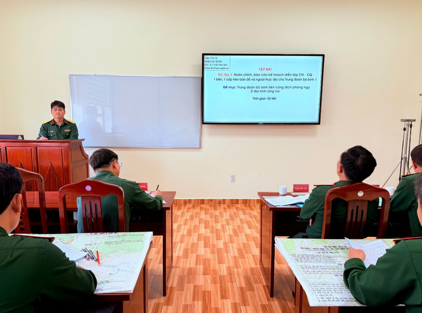 Tại buổi huấn luyện, đồng chí Thượng tá Trần Thế Sơn đã thực hành giảng nội dung bài tập 3: “Hoàn chỉnh, báo cáo kế hoạch diễn tập chỉ huy - cơ quan 1 bên, 1 cấp trên bản đồ và ngoài thực địa cho Trung đoàn bộ binh 1”. Giảng viên đã kết hợp nhuần nhuyễn các phương pháp dạy học tích cực, giúp cho học viên nắm chắc nội dung lý luận, biết kết hợp các nội dung lý thuyệt đã học vào báo cáo các bài tập.