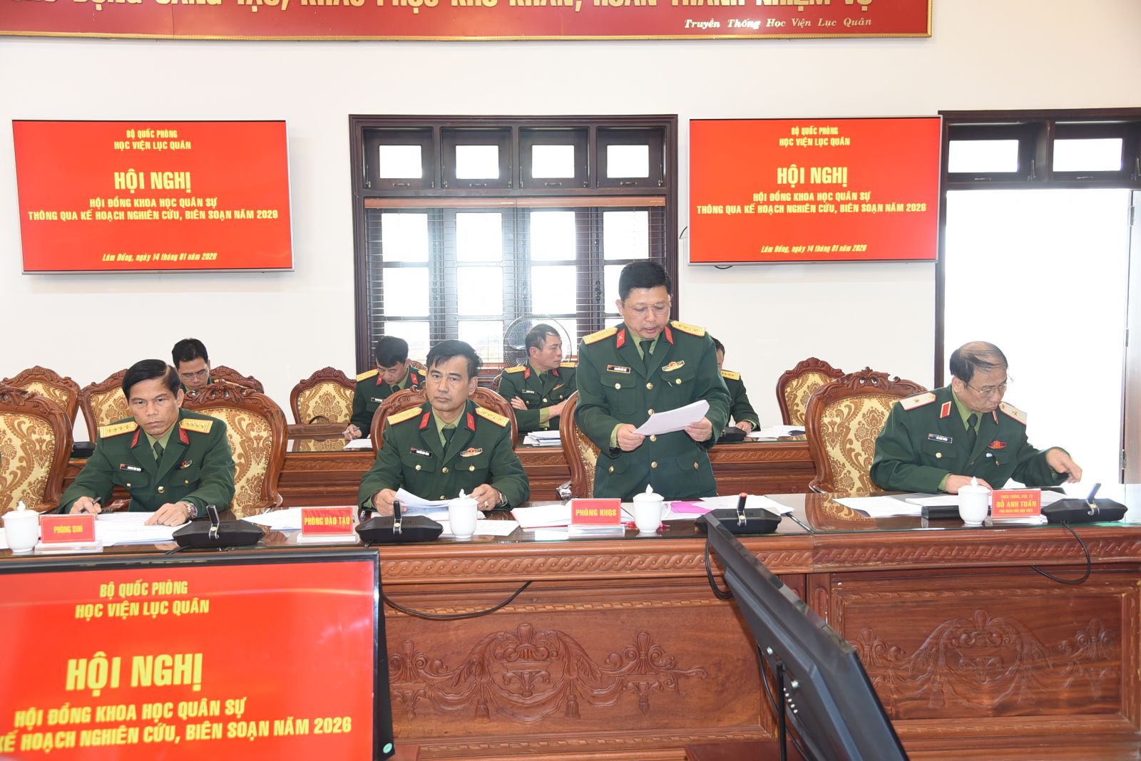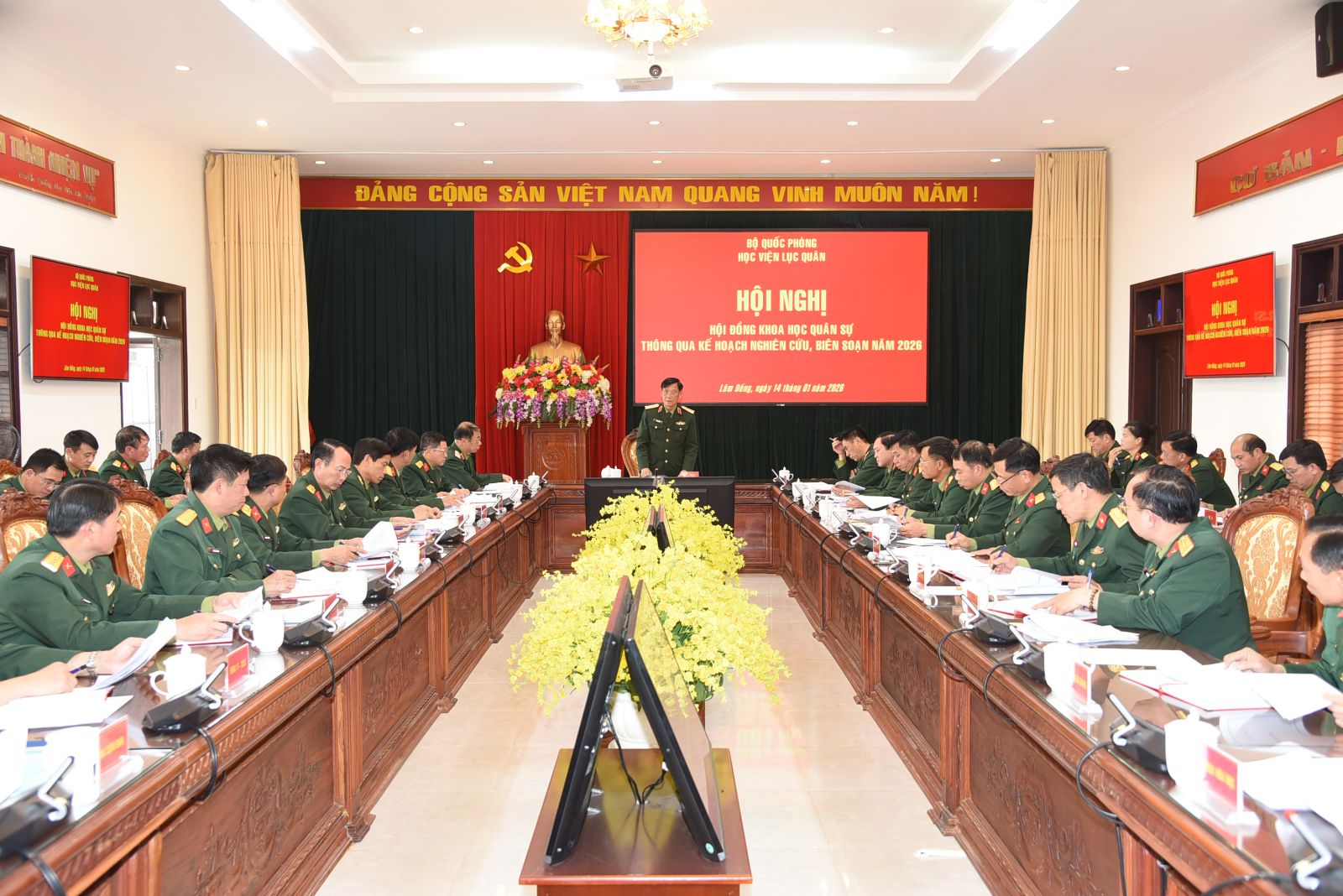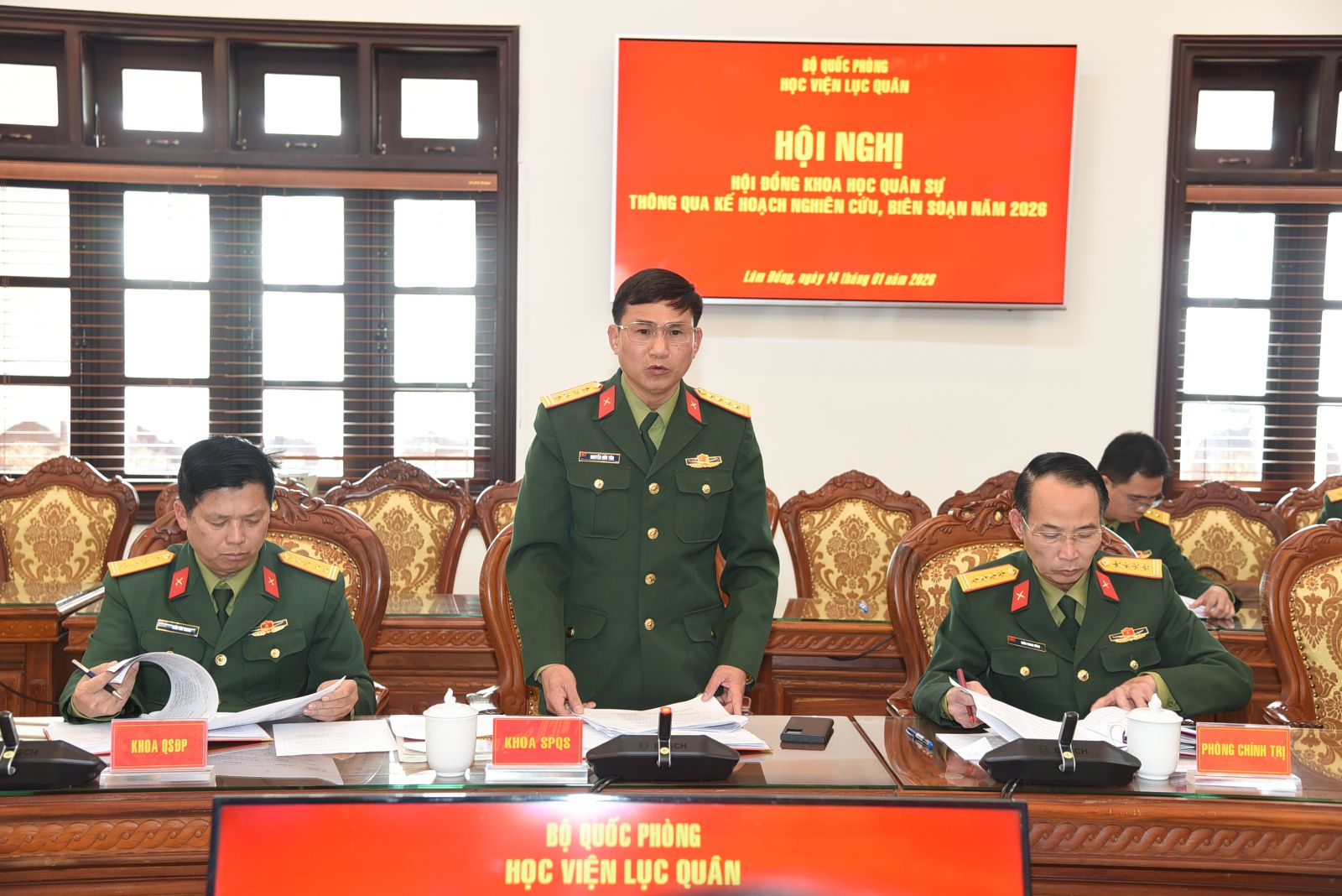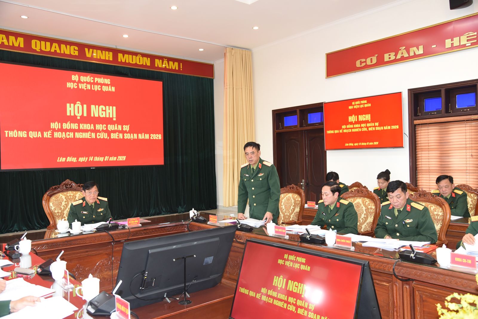 Thực hiện Quyết định số 82/QĐ-HV ngày 10/01/2026 của Giám đốc Học viện phê duyệt Kế hoạch số 07/KH-KHQS ngày 07/01/2026 của Phòng Khoa học quân sự; ngày 14/01/2026, Học viện tổ chức Hội nghị Hội đồng Khoa học quân sự thông qua Kế hoạch nghiên cứu, biên soạn năm 2026. Đồng chí Trung tướng, TS Đỗ Minh Xương - Giám đốc Học viện, Chủ tịch Hội đồng Khoa học quân sự chủ trì Hội nghị. Tham dự Hội nghị còn có các đồng chí trong Ban Giám đốc Học viện, các đồng chí thành viên Hội đồng Khoa học quân sự, đại biểu chỉ huy các cơ quan, đơn vị có nội dung nghiên cứu, biên soạn năm 2026 và cơ quan Phòng Khoa học quân sự.