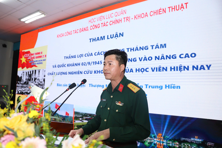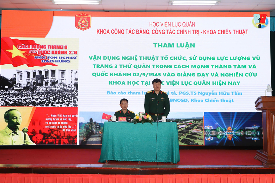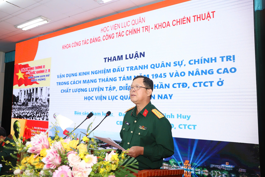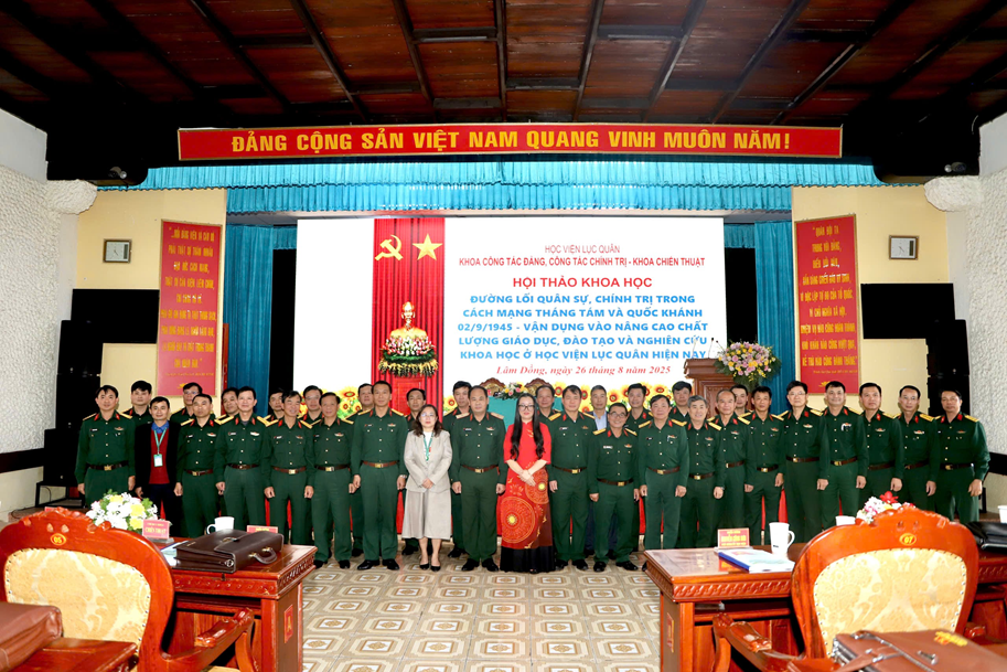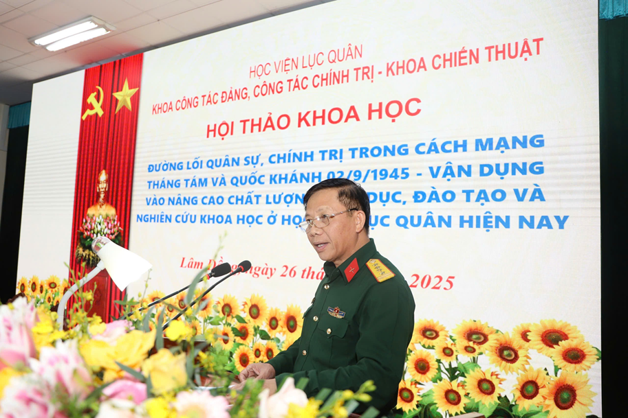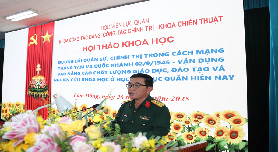 Trong không khí thi đua sôi nổi của toàn quân và dân ta hướng tới kỷ niệm 80 năm Cách mạng Tháng Tám thành công (19/8/1945 - 19/8/2025) và Quốc khánh nước Cộng hòa xã hội chủ nghĩa Việt Nam (02/9/1945 - 02/9/2025), đồng thời chào mừng thành công của Đại hội đại biểu Đảng bộ Học viện Lục quân lần thứ XIV nhiệm kỳ 2025 – 2030 và đón chào năm học mới 2025 – 2026, ngày 26/8/2025, tại Hội trường Trần Hưng Nghĩa, Khoa Công tác đảng, công tác chính trị và Khoa Chiến thuật đã phối hợp tổ chức thành công Hội thảo khoa học với chủ đề: “Đường lối quân sự, chính trị trong Cách mạng tháng Tám và Quốc khánh 02/9/1945 – vận dụng vào nâng cao chất lượng giáo dục, đào tạo và nghiên cứu khoa học ở Học viện Lục quân hiện nay”.