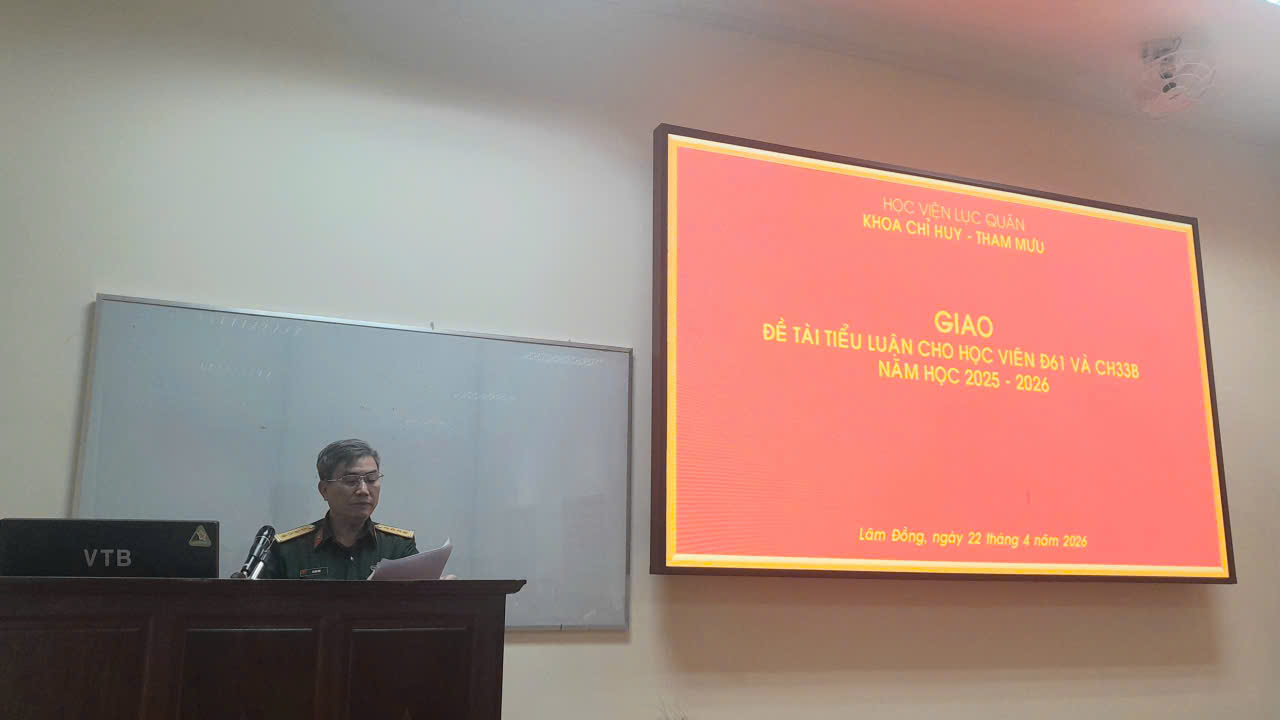 Tối ngày 22/4/2026, tại giảng đường H1/104 Khoa Chỉ huy - Tham mưu tổ chức Hội nghị giao đề tài tiểu luận môn học cho học viên đào tạo trung đoàn trưởng bộ binh Khóa 61 (Đ61), đào tạo thạc sĩ kết hợp đào tạo dài hạn trung đoàn trưởng bộ binh (CH33B), năm học 2025 - 2026.