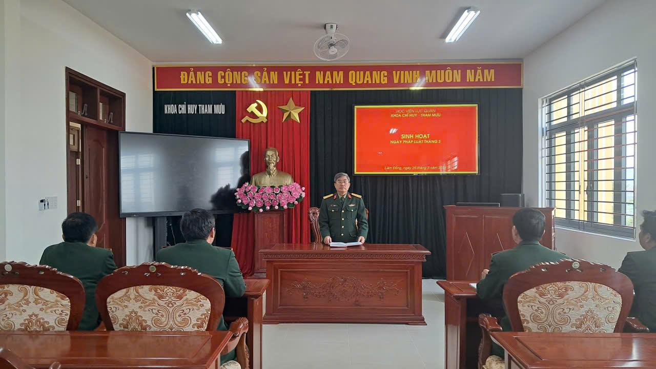 Mở đầu buổi sinh hoạt, chỉ huy Khoa đã tiến hành quán triệt mục đích, ý nghĩa của việc nắm vững các quy định pháp luật mới về công nghệ số. Trong bối cảnh quân đội ta đang đẩy mạnh hiện đại hóa, cán bộ, giảng viên khoa Chỉ huy - Tham mưu không chỉ là người truyền thụ nội dung bài giảng mà còn phải là những người tiên phong trong làm chủ công nghệ số.