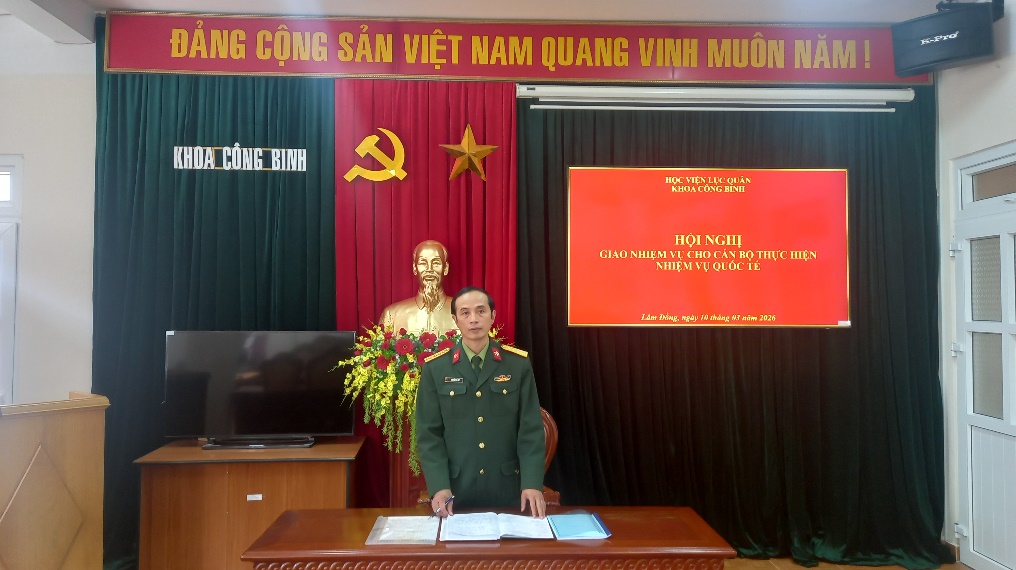 Chấp hành Chỉ thị số 28/CT-BQP ngày 10 tháng 01 năm 2026 của Bộ Quốc phòng về việc giao nhiệm vụ cho Học viện Lục quân trong hợp tác với Lào năm 2026. Ngày 10 tháng 03 năm 2026, Khoa Công binh tổ chức Hội nghị giao nhiệm vụ cho cán bộ thực hiện nhiệm vụ quốc tế. Tham dự Hội nghị các đồng chí trong cấp ủy, chỉ huy các Khoa và toàn thể cán bộ, giảng viên.