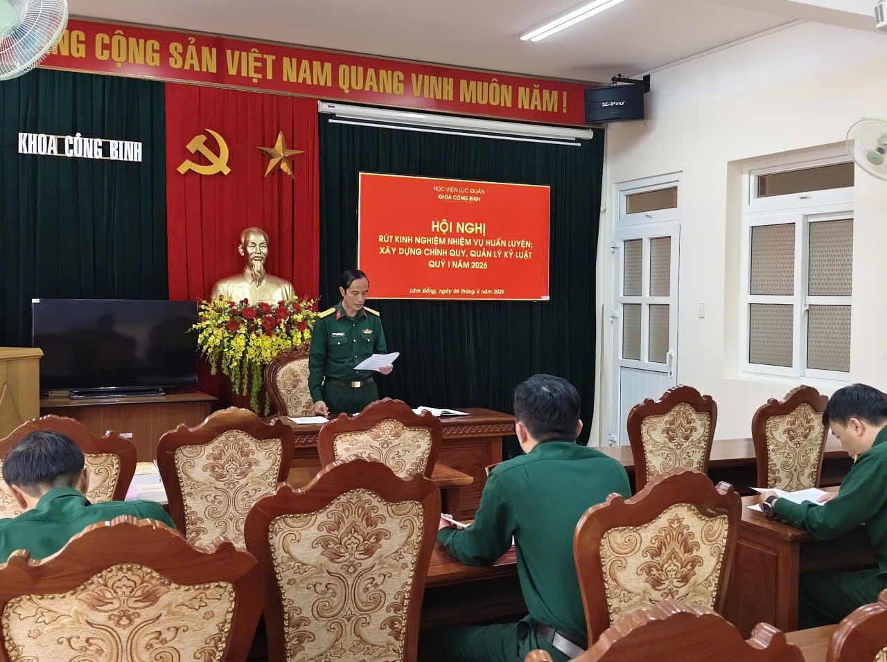 Ngày 07/4/2026, Khoa Công binh đã tổ chức Hội nghị rút kinh nghiệm nhiệm vụ huấn luyện, xây dựng chính quy, quản lý kỷ luật, nhằm đánh giá toàn diện kết quả thực hiện nhiệm vụ trong quý I năm 2026, đồng thời chỉ ra những ưu điểm, hạn chế và đề ra phương hướng, giải pháp nâng cao chất lượng công tác trong thời gian tới. Hội nghị là dịp quan trọng để cán bộ, giảng viên nhìn nhận lại quá trình tổ chức thực hiện nhiệm vụ, góp phần nâng cao chất lượng giáo dục - đào tạo, xây dựng đơn vị vững mạnh toàn diện.
