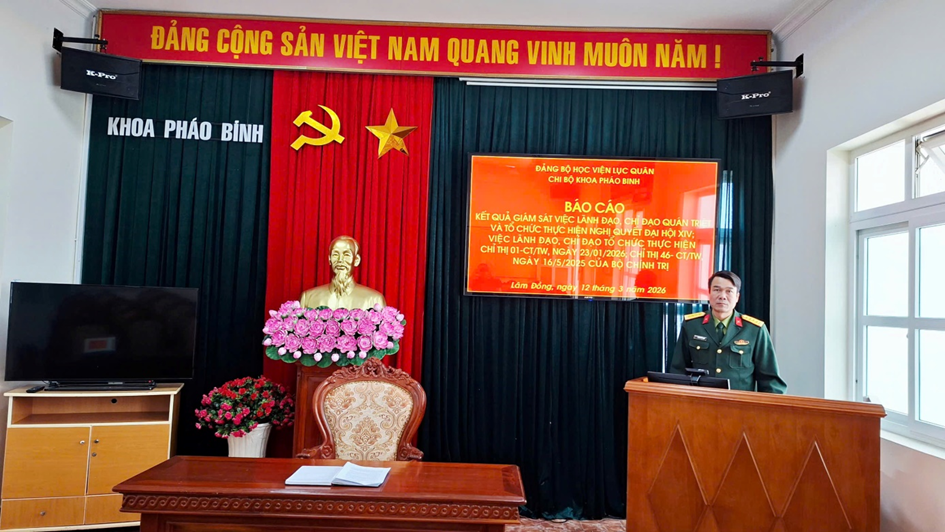 Ngày 12/3/2026 Đoàn Kiểm tra Đảng ủy Học viện đã tiến hành kiểm tra Chi bộ Khoa Pháo binh về kết quả giám sát việc lãnh đạo, chỉ đạo quán triệt và tổ chức thực hiện Nghị quyết Đại hội XIV; việc lãnh đạo, chỉ đạo tổ chức thực hiện Chỉ thị số 01-CT/TW, ngày 23/01/2026; Chỉ thị số 46-CT/TW, ngày 16/5/2025 của Bộ Chính trị về lãnh đạo cuộc bầu cử đại biểu Quốc hội khóa XVI, đại biểu Hội đồng nhân dân các cấp nhiệm kỳ 2026-2031.