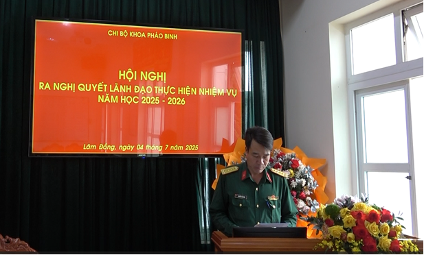 Đồng chí Đại tá, Tiến sĩ Nguyễn Văn Hùng - Bí thư Chi bộ chủ trì Hội nghị ra Nghị quyết lãnh đạo thực hiện nhiệm vụ năm học 2025 - 2026