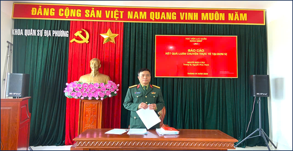 Tại hội nghị, đồng chí Trung tá Nguyễn Phúc Thịnh, giảng viên Khoa Quân sự địa phương, hoàn thành nhiệm vụ luân chuyển thực tế tháng 12/2025, đã trình bày báo cáo kết quả luân chuyển thực tế tại đơn vị. Báo cáo tập trung làm rõ các nội dung chủ yếu như: kết quả nghiên cứu, nắm tình hình thực tiễn trong tổ chức huấn luyện, luyện tập, diễn tập; công tác quản lý, rèn luyện bộ đội; những kinh nghiệm thực tiễn rút ra có thể vận dụng trực tiếp vào giảng dạy. Báo cáo cũng chỉ ra một số khó khăn, vướng mắc trong quá trình thực hiện nhiệm vụ, đồng thời đề xuất các kiến nghị nhằm nâng cao hiệu quả công tác luân chuyển thực tế giảng viên trong thời gian tới.
