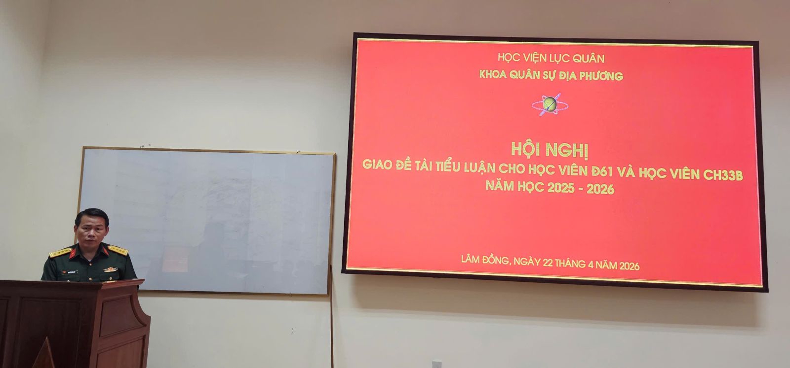 Thực hiện Kế hoạch biên soạn, giao đề tài tiểu luận cho học viên đào tạo trung đoàn trưởng bộ binh Khóa 61 (Đ61) và học viên cao học Khóa 33B (CH33B) năm học 2025 - 2026 của Học viện Lục quân, nhằm nâng cao chất lượng giáo dục - đào tạo cho các đối tượng học viên, ngày 22/4/2026, tại Giảng đường H1, Khoa Quân sự địa phương đã tổ chức hội nghị giao đề tài tiểu luận cho học viên Đ61 và học viên CH33B theo đúng nội dung chương trình đào tạo.