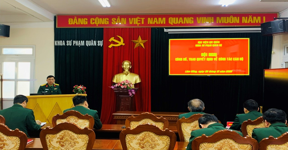 Thực hiện Quyết định số 2595/QĐ-HVLQ ngày 29/12/2025 của Học viện Lục quân về việc điều động, bổ nhiệm cán bộ, ngày 30/12/2025, Khoa Sư phạm quân sự tổ chức Hội nghị công bố và trao quyết định bổ nhiệm chức vụ cho cán bộ.