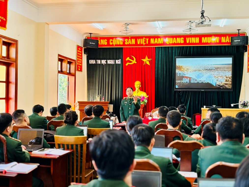 Là đơn vị giữ vai trò trung tâm trong đào tạo công nghệ thông tin và ngoại ngữ, Khoa Tin học - Ngoại ngữ không chỉ đi đầu trong việc ứng dụng chuyển đổi số vào giảng dạy, học tập mà còn là lực lượng nòng cốt trong lan tỏa tinh thần tự học, tự nâng cao năng lực số, góp phần thiết thực vào thực hiện thắng lợi mục tiêu xây dựng Học viện Lục quân thông minh, hiện đại, “mẫu mực, tiêu biểu”. Nhận thức rõ vai trò to lớn đó, thời gian qua, cấp ủy, chỉ huy Khoa Tin học - Ngoại ngữ đã quán triệt sâu sắc các chủ trương, nghị quyết của Đảng, Quân ủy Trung ương, Bộ Quốc phòng và Đảng ủy, Ban Giám đốc Học viện về chuyển đổi số và xây dựng Học viện thông minh, hiện đại. Trên cơ sở đó, Khoa thống nhất nhận thức rằng hưởng ứng và thực hiện phong trào “Bình dân học vụ số” không chỉ là nhiệm vụ thường xuyên, lâu dài, mà còn là giải pháp mang tính đột phá để phát huy vai trò nêu gương của đội ngũ cán bộ, giảng viên trong đổi mới phương pháp giảng dạy, cập nhật công nghệ hiện đại, chuẩn hóa quy trình chuyên môn và hỗ trợ thiết thực việc nâng cao kỹ năng số cho học viên.