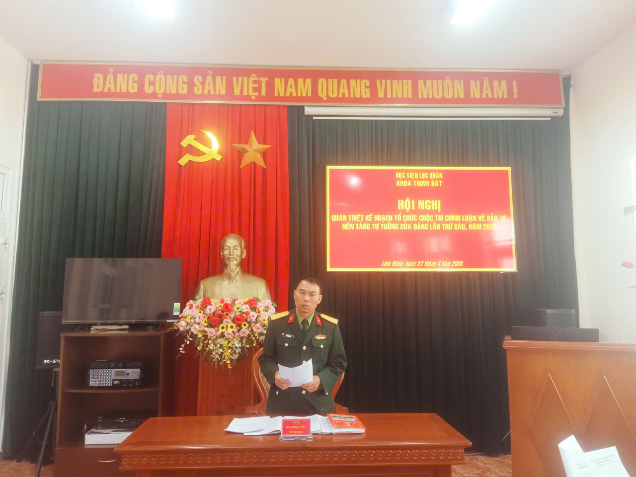 Thực hiện Quyết định số 714/QĐ-HV ngày 26 tháng 3 năm 2026 của Học viện Lục quân phê duyệt Kế hoạch số 52/KH-CT ngày 26 tháng 3 năm 2026 của Phòng Chính trị về tổ chức Cuộc thi chính luận bảo vệ nền tảng tư tưởng của Đảng lần thứ Sáu năm 2026; chiều 27 tháng 3 tháng 2026, tại Phòng Phương pháp của Khoa Trinh sát, đồng chí Đại tá, Tiến sĩ Bùi Đình Quyền, Chủ nhiệm Khoa đã chủ trì sinh hoạt, quán triệt, triển khai nhiệm vụ tham gia Cuộc thi chính luận bảo vệ nền tảng tư tưởng của Đảng lần thứ Sáu năm 2026 tới toàn thể cán bộ, giảng viên trong Khoa.