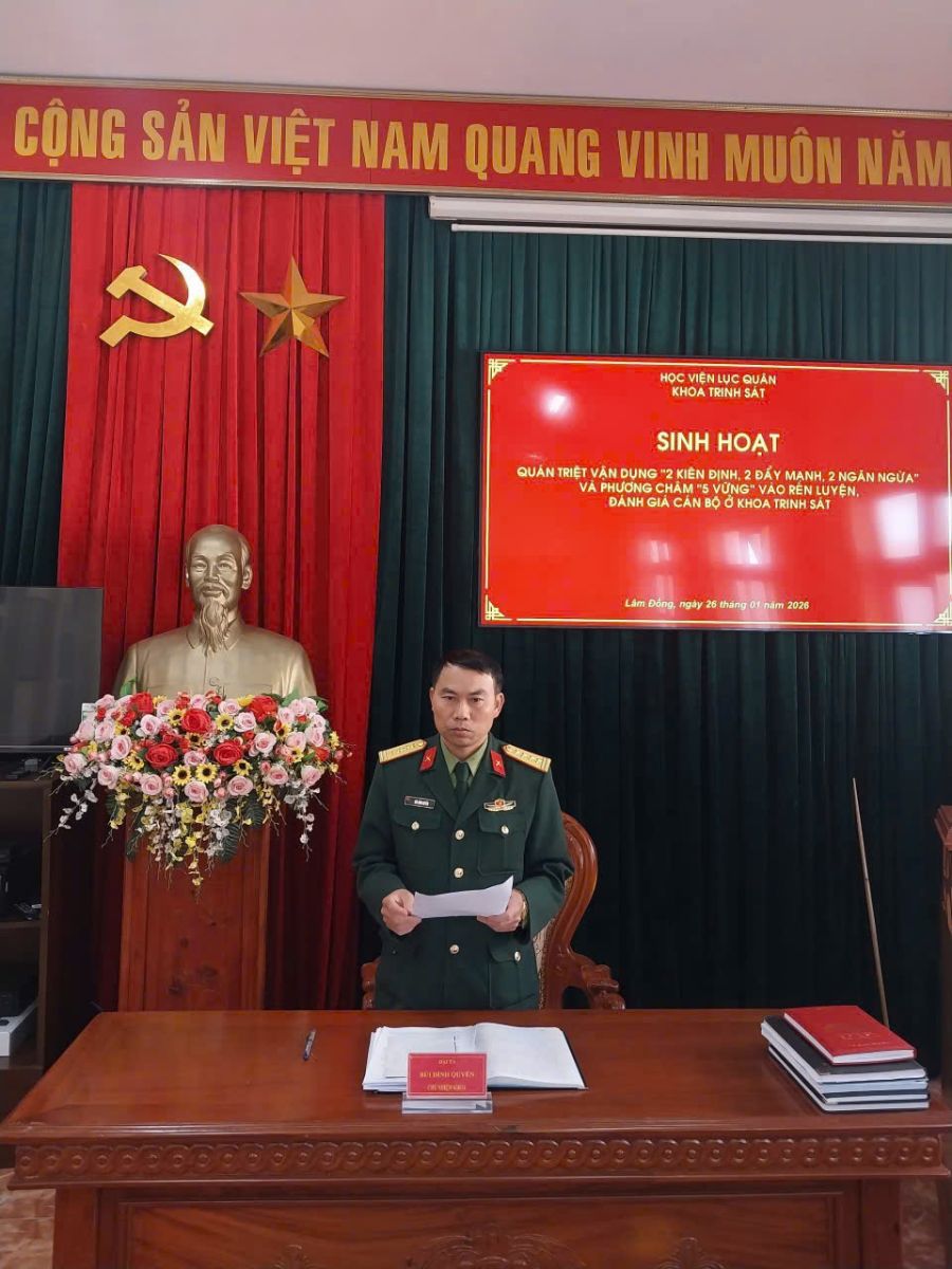 Quán triệt và thực hiện Công văn số 86/HV-CT ngày 22 tháng 01 năm 2026, Chi ủy, chỉ huy Khoa Trinh sát đã nhanh chóng xây dựng kế hoạch, tổ chức phổ biến giáo dục cho 100% cán bộ, giảng viên trong Khoa. Phát biểu chỉ đạo tại buổi quán triệt, đồng chí Đại tá Bùi Đình Quyền - Chủ nhiệm Khoa nhấn mạnh: Trong bối cảnh tình hình thế giới và khu vực có nhiều diễn biến phức tạp, việc nắm vững và thực hiện nội dung “2 kiên định, 2 đẩy mạnh, 2 ngăn ngừa” gắn với phương châm “5 vững” là “kim chỉ nam” để mỗi quân nhân hoàn thành tốt nhiệm vụ được giao.
