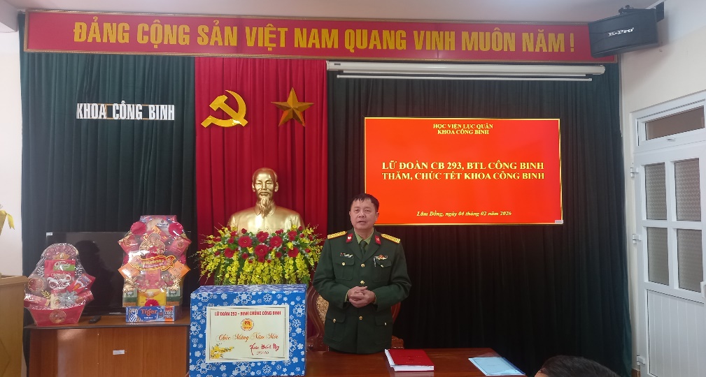 Trong không khí ấm áp, thân tình, đồng chí Đại tá Phạm Văn Chuyên đã thăm hỏi sức khỏe, quá trình công tác, đời sống của cán bộ, giảng viên Khoa Công binh và chia sẻ tình hình thực hiện nhiệm vụ của Lữ đoàn Công binh 293. Trong năm 2026, Lữ đoàn tiếp tục thực hiện nhiều nhiệm vụ quan trọng mà Đảng, Nhà nước và Quân đội giao cho như xây dựng biển đảo, thi công công trình ngầm, đường sắt cao tốc và rà phá bom mìn còn sót lại từ chiến tranh. Đồng chí cũng đã đánh giá cao kết quả giáo dục, đào tạo của Khoa Công binh trong thời gian vừa qua. Quá trình đào tạo của Khoa nói riêng và Học viện Lục quân nói chung đã góp phần quan trọng vào kết quả thực hiện nhiệm vụ của Lữ đoàn và trong toàn quân. Cán bộ của Lữ đoàn sau khi đào tạo tại Học viện Lục quân đã nhanh chóng tiếp cận, vận dụng kiến thức đã học vào thực hiện nhiệm vụ, có nhiều đồng chí phát triển thành các cán bộ chủ chốt của đơn vị và Binh chủng. Đồng chí Lữ đoàn trưởng tin tưởng Khoa Công binh sẽ tiếp tục phát huy truyền thống “Mở đường thắng lợi” của bộ đội Công binh anh hùng trong đào tạo các thế hệ học viên đáp ứng yêu cầu nhiệm vụ trong giai đoạn cách mạng mới, tiếp tục đồng hành, chia sẻ với Lữ đoàn trong quá trình thực hiện nhiệm vụ. Nhân chuyến thăm, chúc Tết, đồng chí Lữ đoàn trưởng đã tặng quà, chúc cán bộ, giảng viên Khoa Công binh tiếp tục phát triển, hoàn thành tốt nhiệm vụ trong giai oạn cách mạng mới.