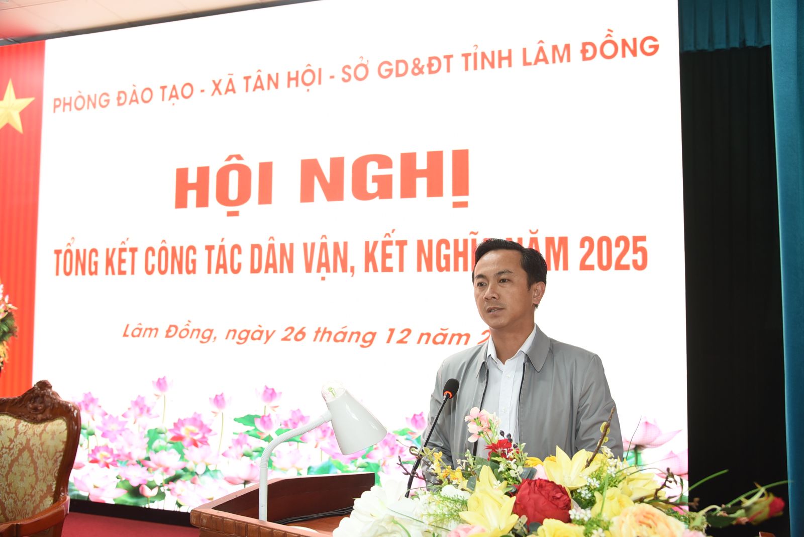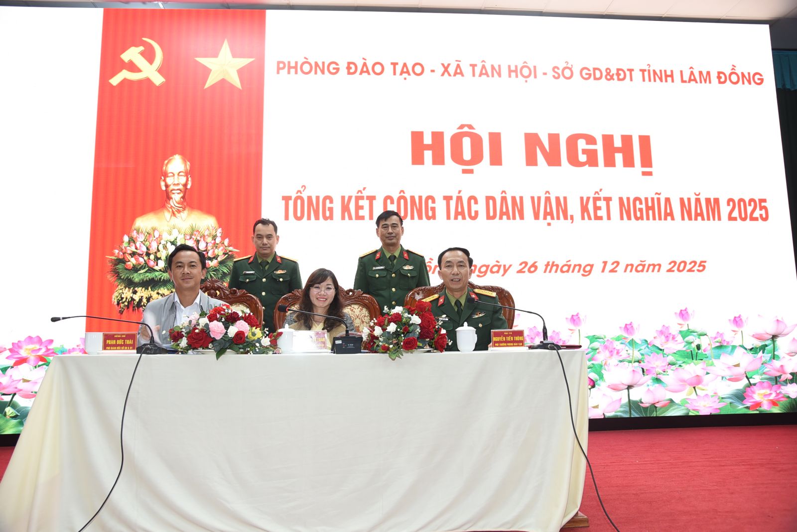 Thực hiện Kế hoạch số 336/KH-ĐT ngày 18/12/2025 của Phòng Đào tạo đã được Thủ trưởng Học viện Lục quân phê duyệt về tổng kết công tác dân vận kết nghĩa năm 2025. Chiều ngày 26/12/2025, Phòng Đào tạo/Học viện Lục quân, Sở Giáo dục và Đào tạo, xã Tân Hội tỉnh Lâm Đồng tổ chức Hội nghị Tổng kết công tác dân vận, kết nghĩa năm 2025. Dự Hội nghị có các đồng chí Đại biểu của cơ quan Phòng Chính trị; lãnh đạo, chỉ huy Phòng, chỉ huy các đơn vị, tổ chức quần chúng trực thuộc Phòng Đào tạo; lãnh đạo Sở, các phòng, ban, đoàn thể của Sở Giáo dục & Đào tạo tỉnh Lâm Đồng và xã Tân Hội.