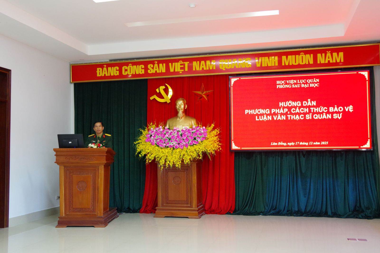 Nhằm trang bị cho học viên cao học những kiến thức, kỹ năng cần thiết để chuẩn bị tốt cho quá trình bảo vệ luận văn thạc sĩ quân sự, sáng ngày 17 tháng 12 năm 2025, Phòng Sau đại học đã tổ chức lớp bồi dưỡng phương pháp bảo vệ luận văn thạc sĩ quân sự cho học viên cao học Khóa 32. Hoạt động này thể hiện sự quan tâm sâu sát của Ban Giám đốc Học viện và cơ quan chức năng trong việc nâng cao chất lượng đào tạo sau đại học, đồng thời giúp học viên tự tin, chủ động và đạt kết quả cao trong buổi bảo vệ luận văn trước hội đồng đáng giá.