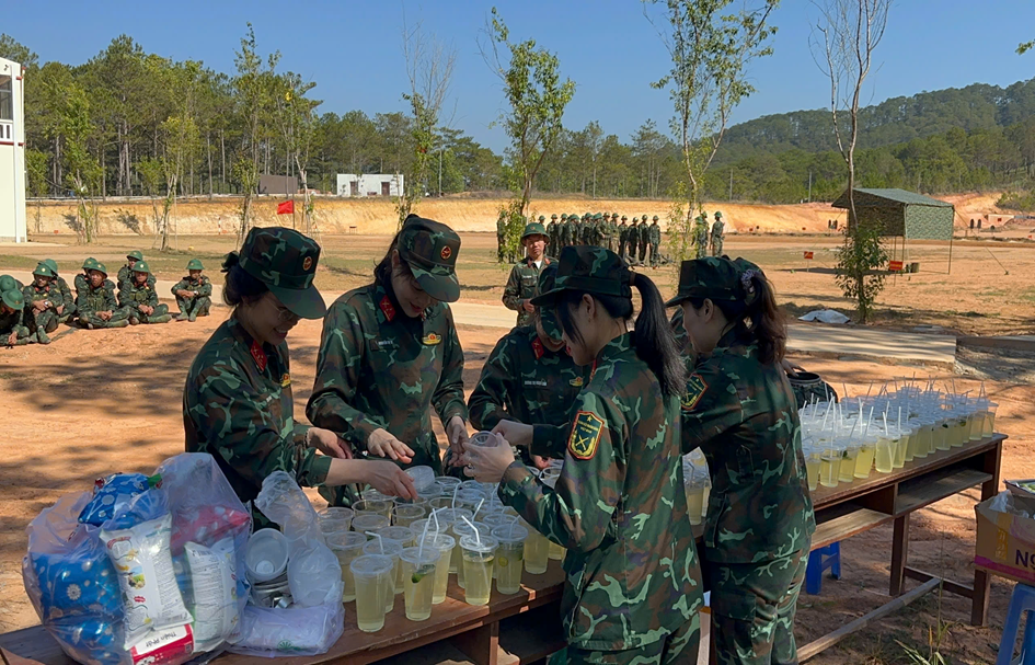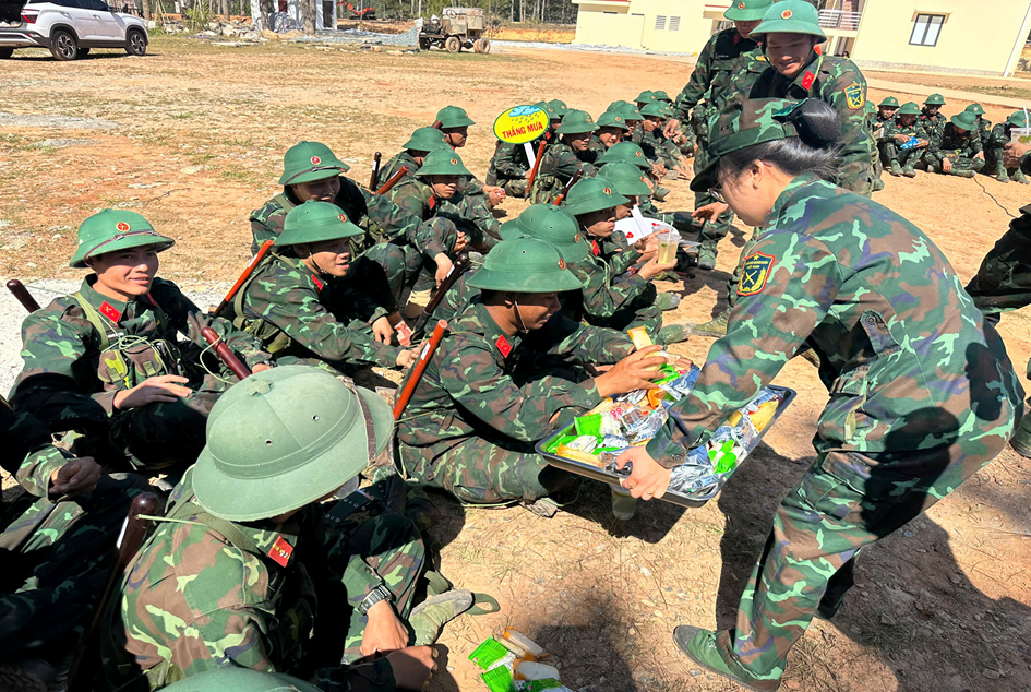 Hội Phụ nữ Học viện Lục quân trao nước giải khát, “tiếp sức thao trường” cho chiến sĩ mới Đại đội 1 trong giờ nghỉ giải lao