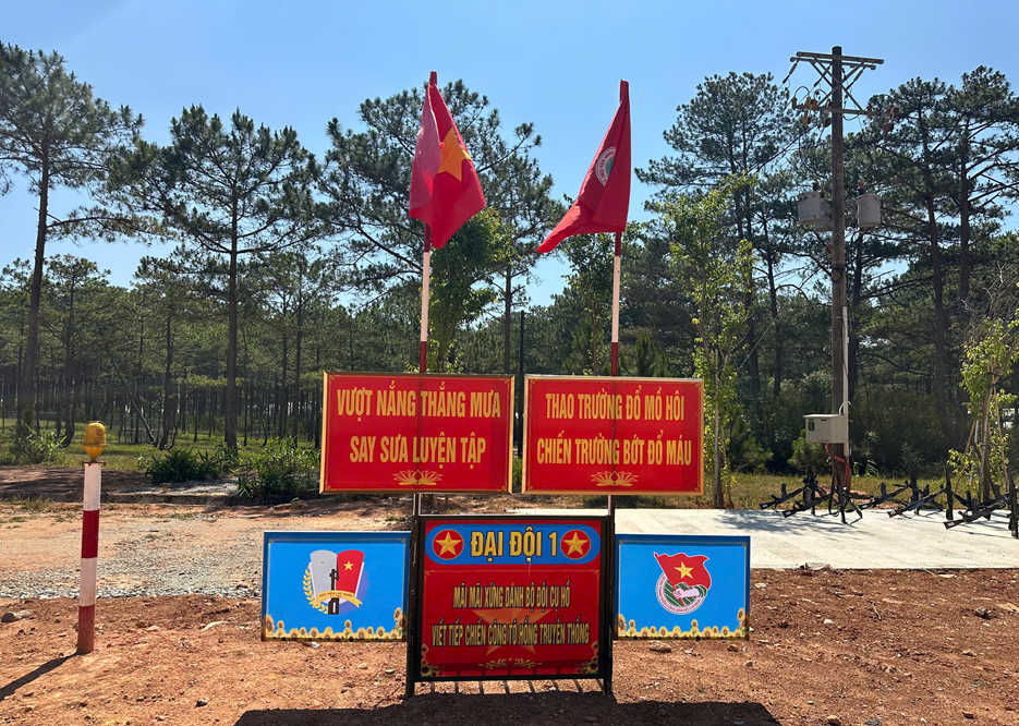 Khu vực thao trường Đại đội 1 được trang trí khẩu hiệu cổ động, tạo khí thế thi đua sôi nổi trong huấn luyện