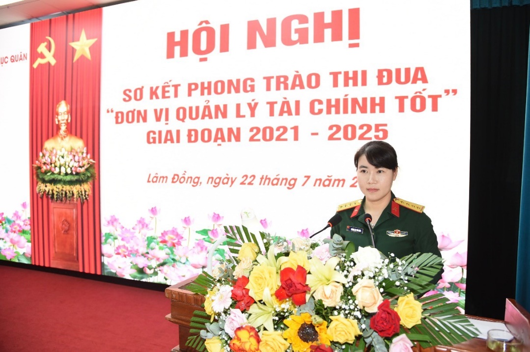 Đại úy Hoàng Thị Thu Nga phát biểu trong Hội nghị sơ kết phong trào thi đua “Đơn vị quản lý tài chính tốt” giai đoạn 2021-2025