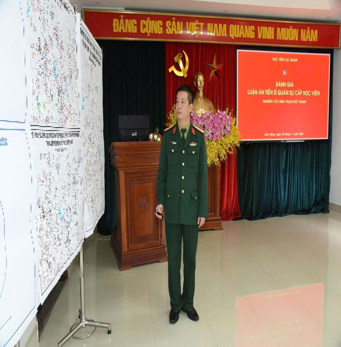Trung tá Phạm Đức Thanh báo cáo bảo vệ luận án tiến sĩ quân sự cấp Học viện